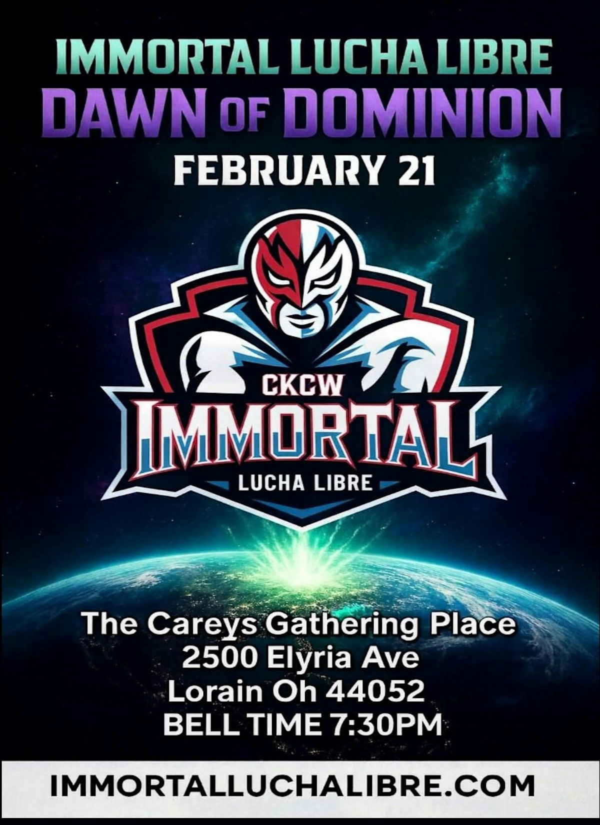 Immortal Lucha Libre returns to Lorain with DAWN OF DOMINION — a high‑energy night of pro wrestling featuring top talent, family‑friendly excitement, and the beginning of a new era. Join us February 21 at The Careys Gathering Place for hard‑hitting action, VIP experiences, and a show built for true wrestling fans