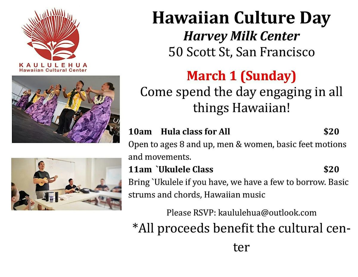 SAN FRANCISCO – Hālau o Keikiali`i, led by Kumu Hula Kawika Keikiali`ihiwahiwa Alfiche is excited to announce Hawaiian Culture Day at the Harvey Milk Center Center in San Francisco! Join us for a fun and relaxing day of Hula classes for all. Come and enjoy the beautiful movements of Hula, strum an `Ukulele, or make a Lei in a welcoming and inclusive environment. No experience is necessary, just bring your enthusiasm and be ready to have a great time! September 14 (Sunday) 10-11am Hula Class $20 and 11-12pm `Ukulele class $20. Drinks and snacks will be available for purchase.
