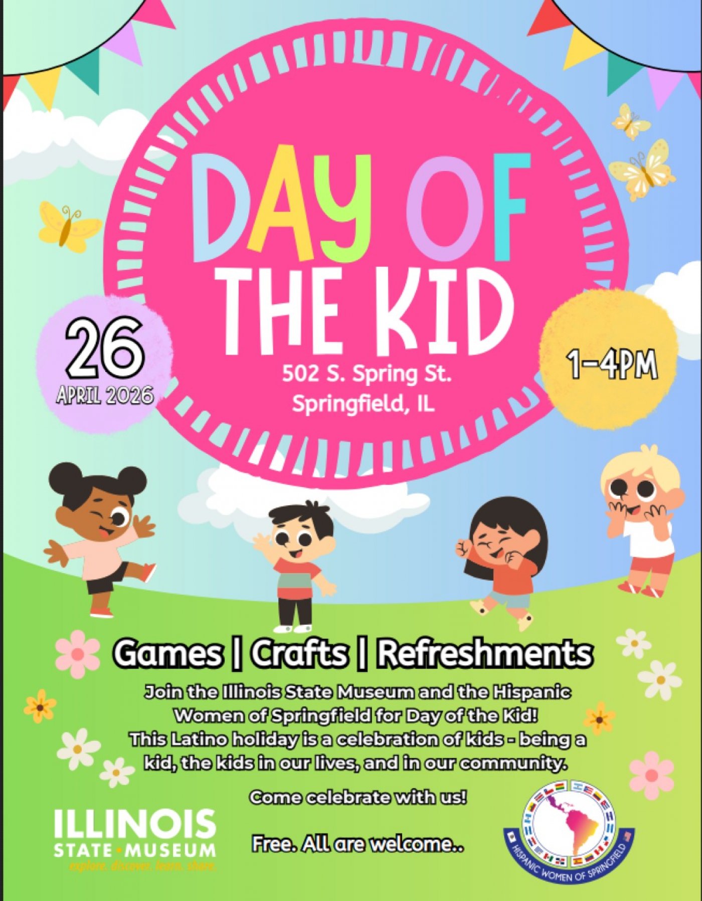Join the Illinois State Museum and the Hispanic Women of Springfield for Day of the Kid! This Latino holiday is a celebration of kids - being a kid, the kids in our lives, and in our community. Come celebrate with us! Join the Illinois State Museum and the Hispanic Women of Springfield for Day of the Kid! This Latino holiday is a celebration of kids - being a kid, the kids in our lives, and in our community. Come celebrate with us! FFrreeee.. AAllll aarree wweellccoommee.Games, Crafts, and Refreshments.
