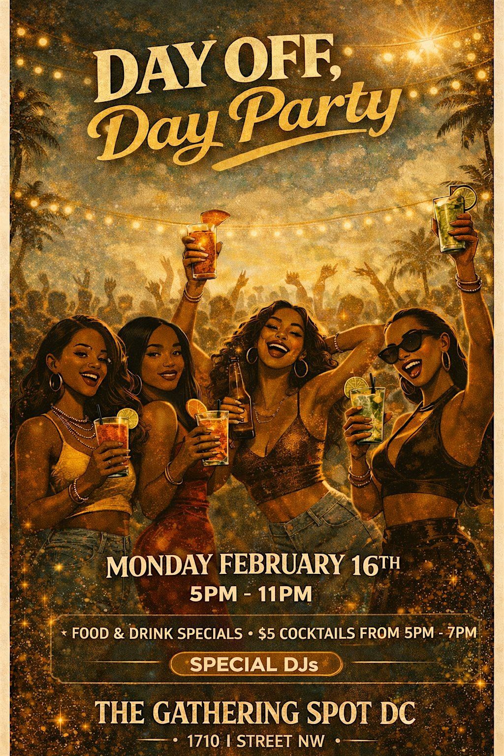 Join us for Day Off, Day Party at The Gathering Spot DC on Monday, February 16th, from 5PM to 11PM.