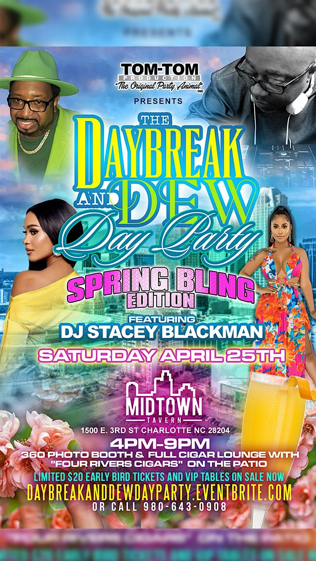 ●TOM-TOM PRODUCTION THE ORIGINAL PARTY ANIMAL PRESENTS ●THE DAYBREAK AND DEW DAY PARTY ● SPRING BLING EDITION ● FEATURING DJ STACEY BLACKMAN FROM 105.3 ● FRESH AIR, HIGH ENERGY! ● SPRING IS OFFICIALLY HERE AND WE'RE BRINGING A BRAND NEW VIBE TO THE CITY ● JOIN US FOR DAYBREAK AND DEW ● THE ULTIMATE SPRING BLING DAY PARTY EXPERIENCE ● LIVE SATURDAY APRIL 25TH, 2026 ● 4PM-9PM ● MIDTOWN TAVERN 1500 E.3RD ST CHARLOTTE NC 28204 ● FULL CIGAR LOUNGE ON THE PATIO WITH (FOUR RIVERS CIGARS) ● 360 PHOTO BOOTH ● LIMITED $20 EARLY BIRD TICKETS AND VIP TABLES ARE ON SALE NOW!