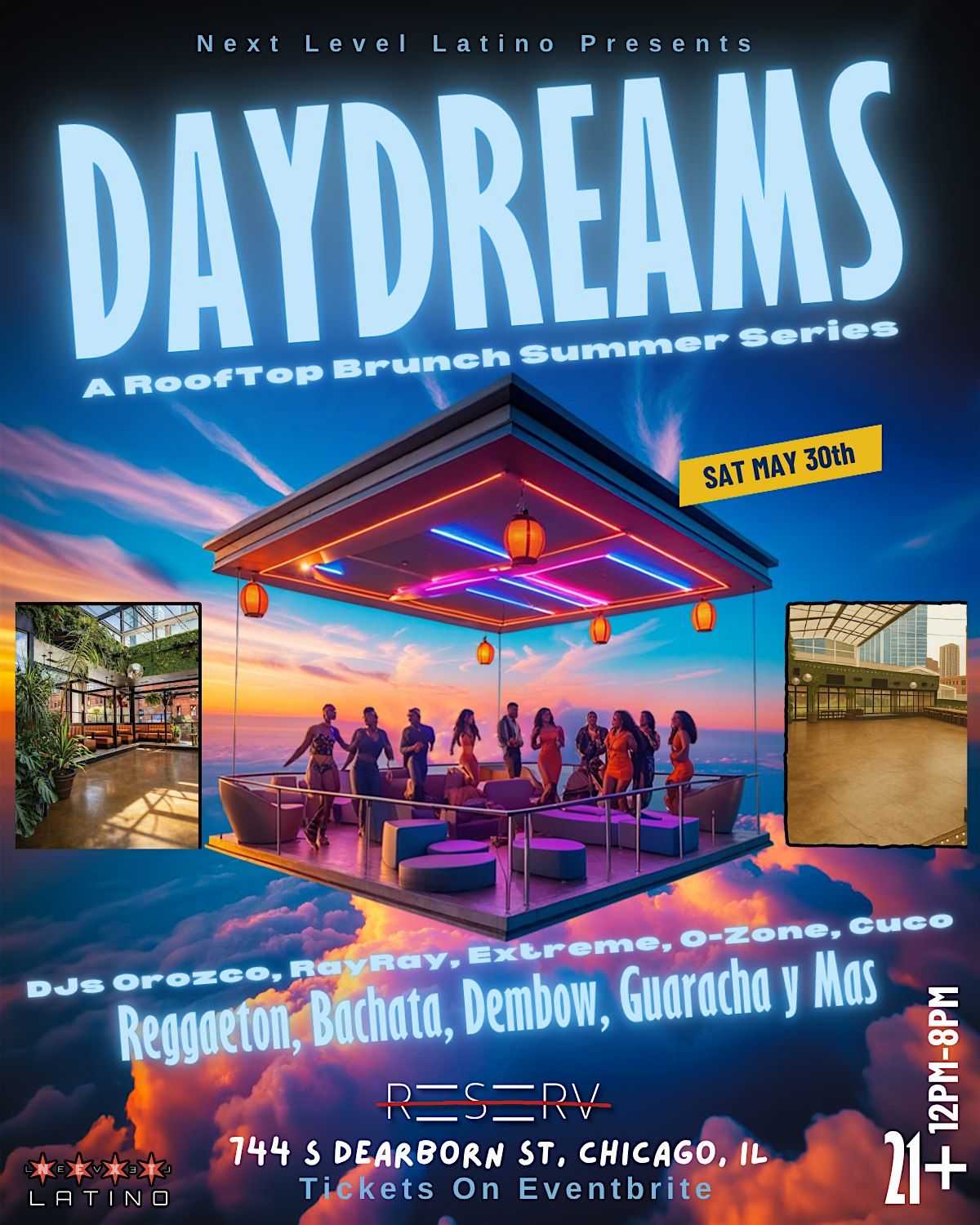 DAYDREAMS hits the rooftop Saturday, May 30th at RESERV Chicago12PM–8PM | 21+Sounds by Orozco, RayRay, Extreme, O-Zone & Cuco spinning the best of Reggaeton, Bachata, Dembow, Guaracha y más.Brunch, views, sunsets, and nonstop energy all day.Tickets on Eventbrite.