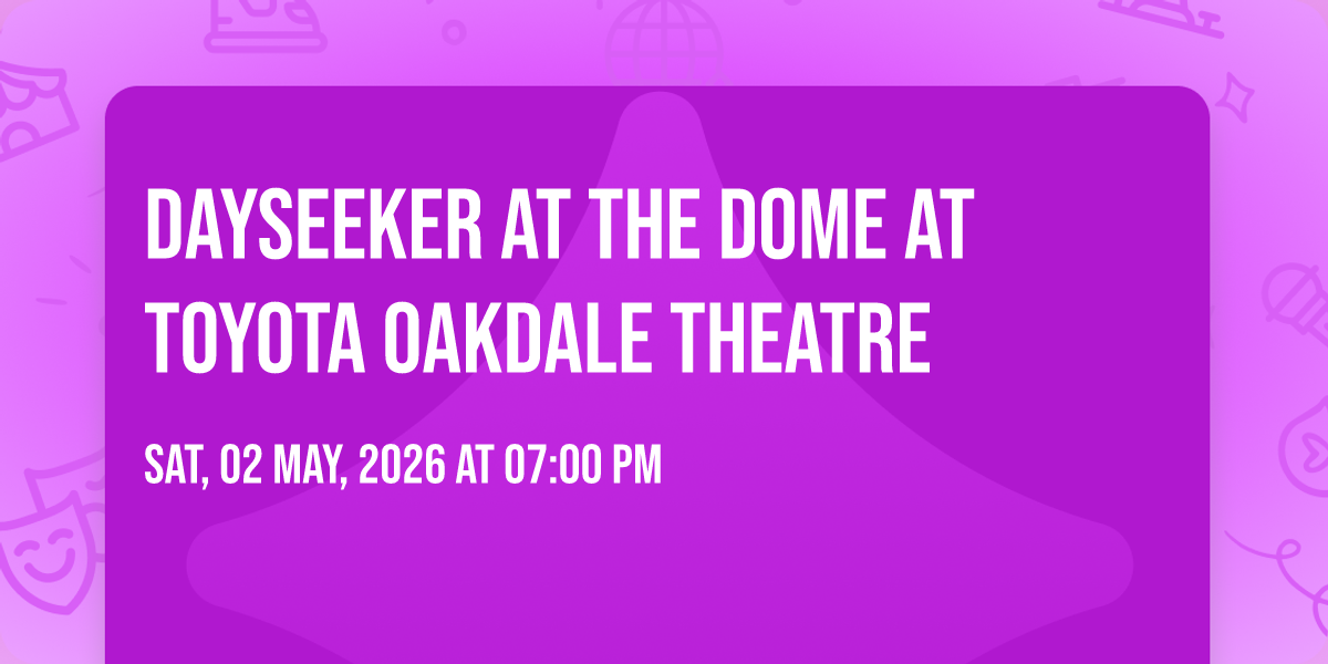 π Be part of history at Dayseeker at The Dome at Toyota Oakdale Theatre, an extraordinary gathering that will captivate your imagination! ποΈ The prestigious The Dome at Toyota Oakdale Theatre in Wallingford, CT sets the stage for an unforgettable experience on May 2nd, 2026 at 07:00 PM. β¨ They are bringing together the finest elements of entertainment and innovation to create moments that will take your breath away. From the moment you arrive, you'll be immersed in an atmosphere of wonder and excitement. π― This carefully planned event ensures every guest experiences something truly special. π Early booking is recommended for this must-attend event of the season!
