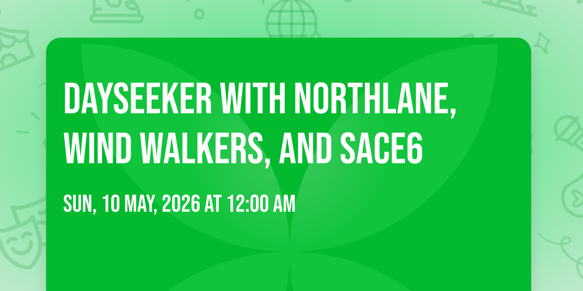 ๐ Location: 44.4859, -88.0582๐ Welcome to Dayseeker with Northlane, Wind Walkers, and Sace6, where the impossible becomes possible and dreams take flight! ๐๏ธ Join us at EPIC Event Center - Green Bay in the heart of Green Bay, WI for an event that will redefine your expectations. ๐ On May 10th, 2026 at 12:00 AM, witness the transformation of space and time into something truly magical. โจ It's a curated experience combining the best of innovation, entertainment, and community spirit, creating moments that will be remembered for years to come. Whether you're a first-time visitor or a seasoned enthusiast, prepare to be amazed. ๐ Book now to ensure your place in this unforgettable experience!