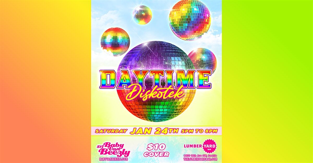 Rise, shine, and werk at Daytime Diskotek —a glitter-soaked, joy-fueled dance party for the divas who wanna dance their faces off AND be in bed by 9. Join us at The Lumberyard Bar on 1/24 from 5pm–8pm for a colorful, high-vibe party, packed wall-to-wall with gay anthems, queer classics, disco delights, pop bangers, and feel-good heaters that keep the dancefloor popping while the sun’s still up. Come serve looks, shake it down with your people, scream-sing the choruses, hydrate responsibly, and still make it home in time for skincare and cozy pajamas—because balance, babe