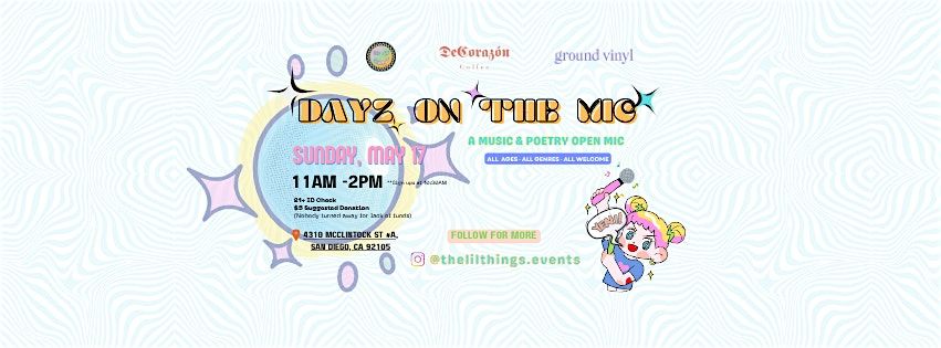 Mark your calendar for May 17, 2026 at 11:00 AM (sign-ups @10:30AM) and join us at local and wonderful outdoor cafe, DeCorazon Coffee Bar, for an exciting time of music and poetry! Whether you want to perform or just vibe with the crowd, this open mic is the perfect spot to share your serious talents or simply to have fun while expressing yourself. In addition to DeCorazon's drink menu, we'll have food and adult beverages available (21+ ID Check) and some vendors/ artists there for you to check out. Bring your friends, good energy and creativity – see you all there!