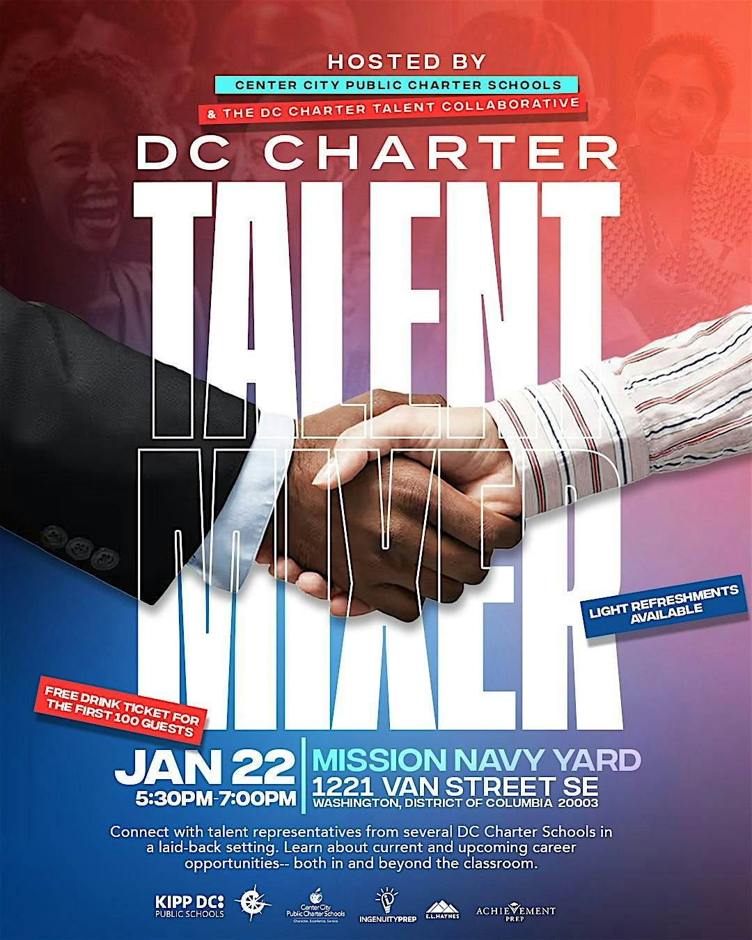 Join us for a fun and casual evening at the DC Talent Recruitment Happy Hour! This in-person event is the perfect chance to connect with local pros, chat about opportunities, and expand your network while enjoying some great vibes. Whether you're hunting for your next gig or just want to mingle with the talent community, come on by and make some awesome connections! Featuring representatives from Achievement Prep PCS, Capital City PCS, Center City PCS, E.L. Haynes PCS, Ingenuity Prep PCS, and KIPP DC Public Schools!