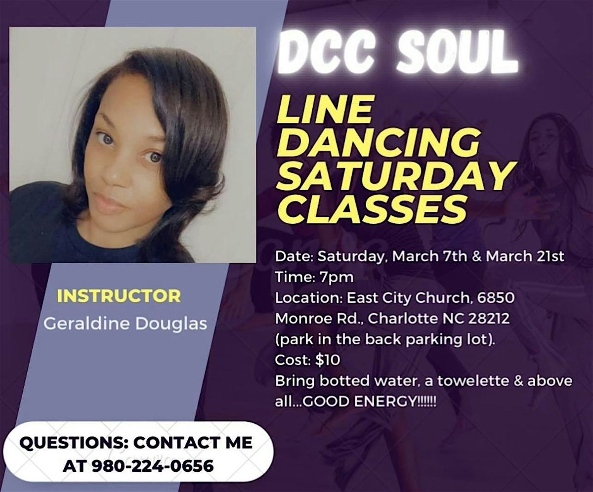 Welcome to the DCC Soul Line Dancing Saturday Classes! Join us at East City Church, 6850 Monroe Rd 100 on March 7th and March 21st at 7:00 PM (Eastern Time) for fun evenings of line dancing. No experience necessary, just come ready to groove and have a good time with our amazing instructor. See you there!