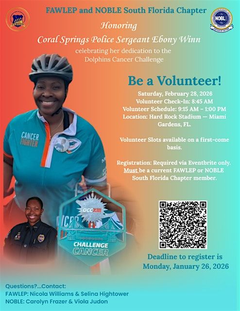 Join FAWLEP and NOBLE South Florida Chapter in honoring Sgt. Ebony Winn's legacy through voluteer service at the Dolphins Cancer Challenge.About this Event