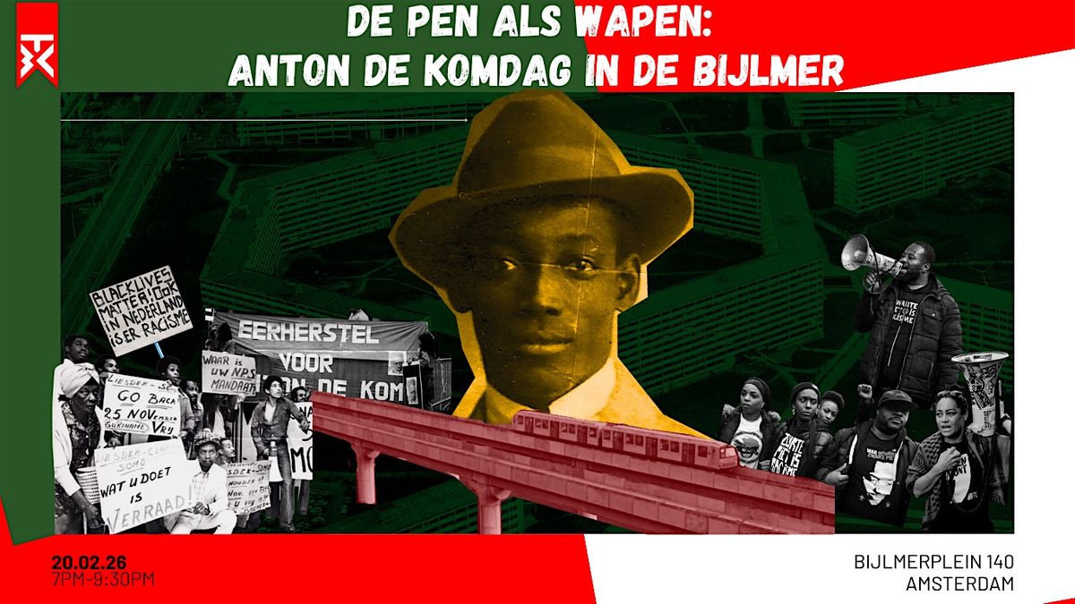 Anton de Kom was verzetsstrijder, antikoloniaal denker, maar ook schrijver en poëet. Die literaire kant van zijn werk brengen we vanavond tot leven: spoken word, intellectuele voordrachten en live muziek. Speakers en artiesten met roots in de Bijlmer en die TBAs tijdelijke locatie in Zuidoost een bijzondere plek hebben gemaakt, brengen hun tribute.