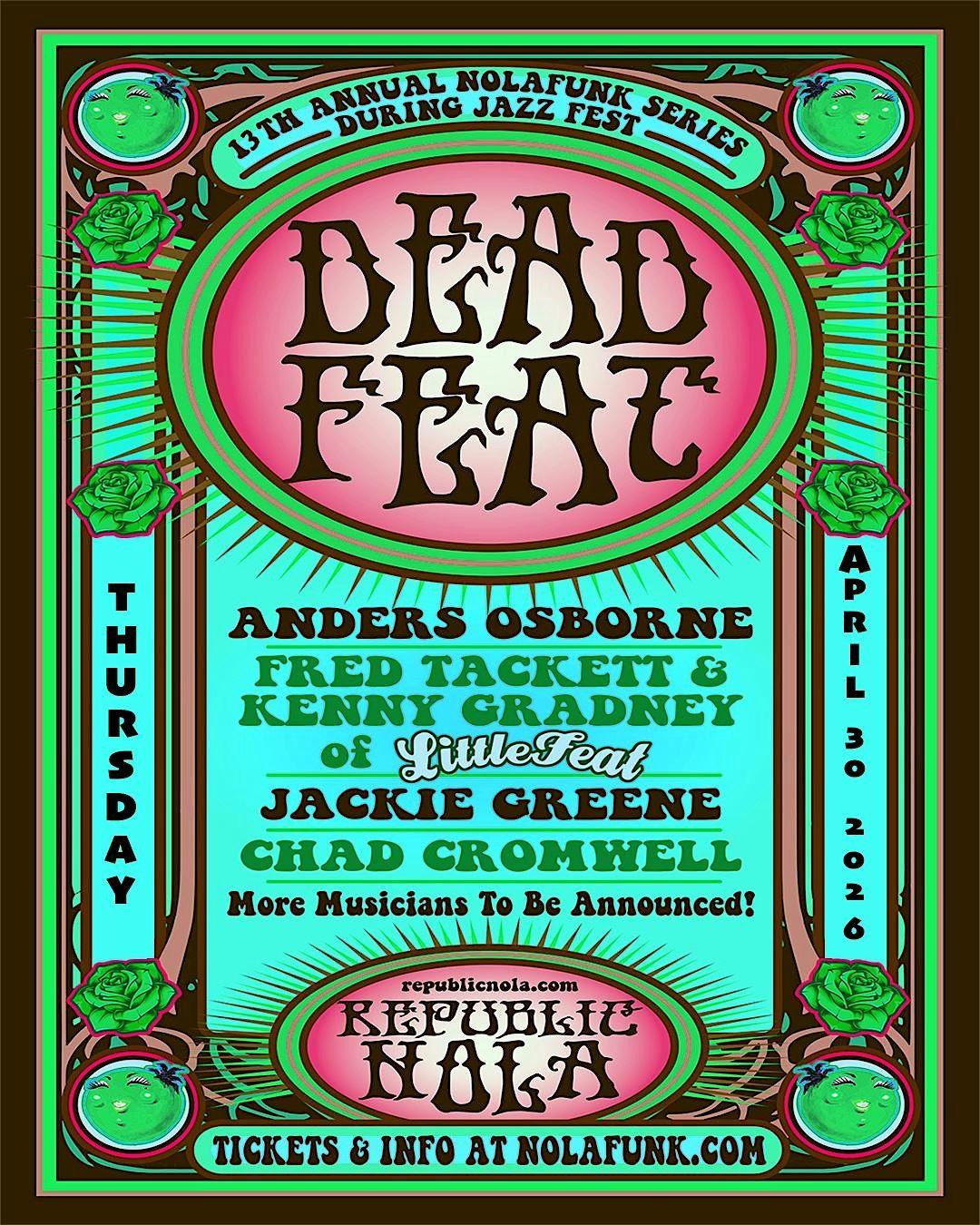 Dead Feat, a longtime fan favorite, is also back with its signature blend of Grateful Dead and Little Feat classics (Fred Tackett and Kenny Gradney of Little Feat are in the band), plus deep-cut Anders Osborne tunes and traditional New Orleans staples.