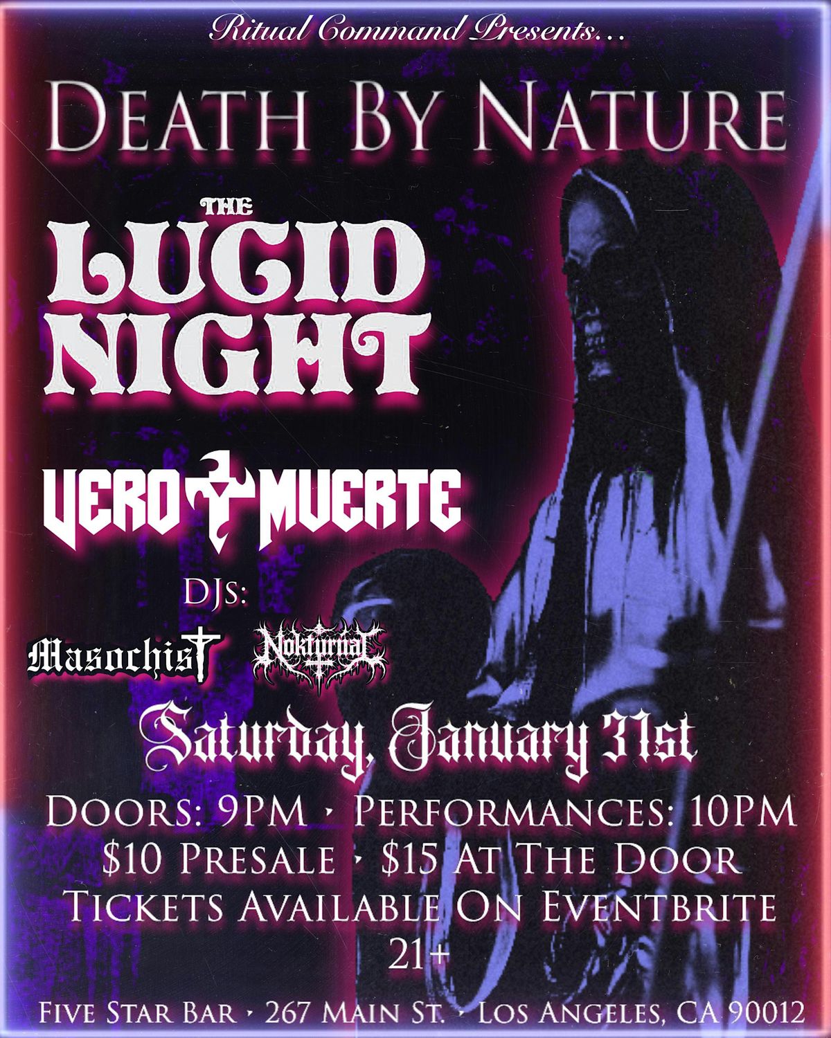 Death By Nature, The Lucid Night, and Vero Muerte take over The Five Star Bar alongside DJ Masochist and DJ Nokturnal