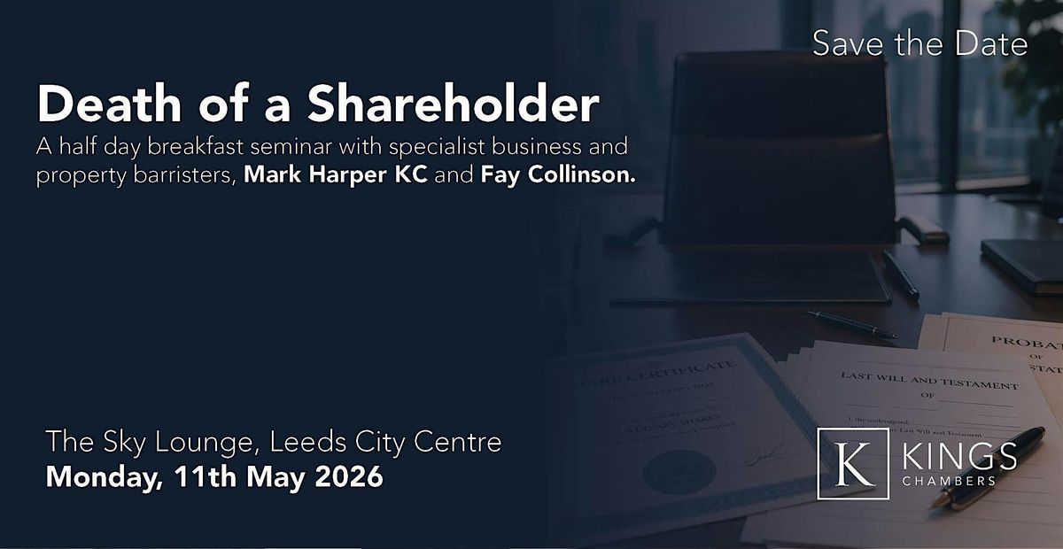 Death of a Shareholder - a half day conference with specialist business and property barristers, Mark Harper KC and Fay Collinson, to explore the company and probate (contentious and non contentious) issues that arise when a shareholder passes away and how tackle them in practice.