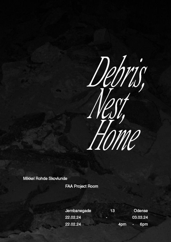 For his solo exhibition “Debris, Nest, Home” Mikkel Rohde Skovlunde examines the potential of ressources, waste, co-existence and home. He refers to his work as “thought-production” rather than art-production and the outcome as “language sculptures”; something that seeks to challenge the limits of cemented thinking structures.