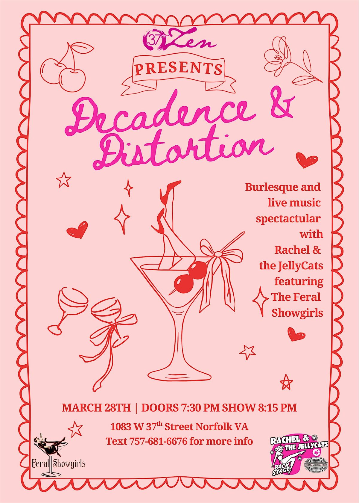 Decadence & Distortion is a high-sensory collision of live rock and classic burlesque — a night where sultry vocals, electric guitar, and unapologetic tease share the same stage. Expect smoky atmosphere, bold striptease, and the kind of decadent energy that feels both timeless and thrillingly untamed.