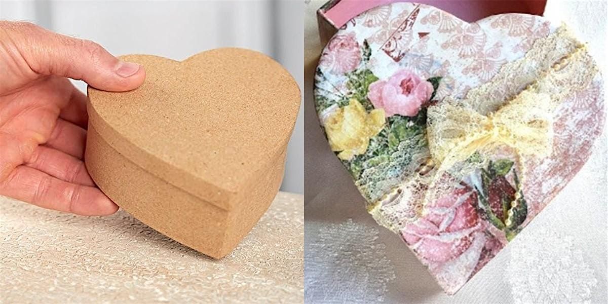Let your creativity run wild as you choose from a box of mixed media decorating tricks to create a beautiful Valentine-themed box! Give empty as a keepsake container or use as a decorative gift box. Box measures approximately 4.5x5 inches.