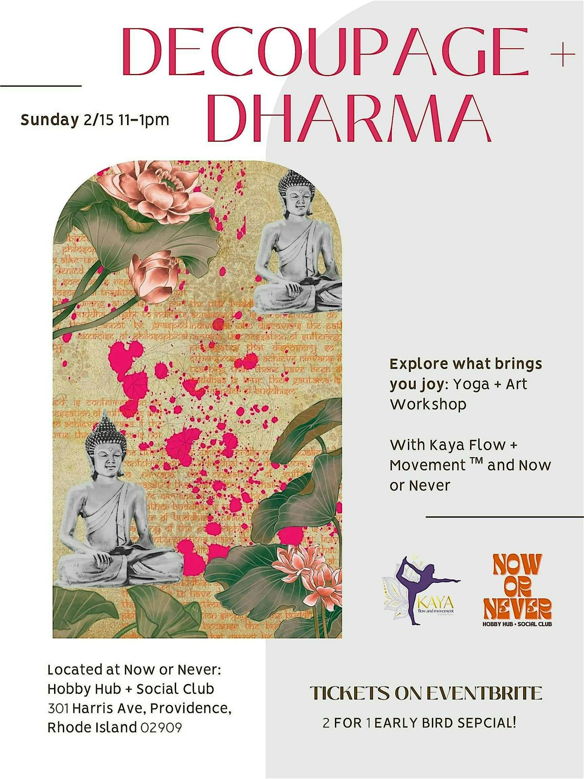 Join us for a nourishing Sunday morning blending gentle yoga and creative expression at Now or Never: Hobby Hub + Social Club and Kaya Flow + Movement