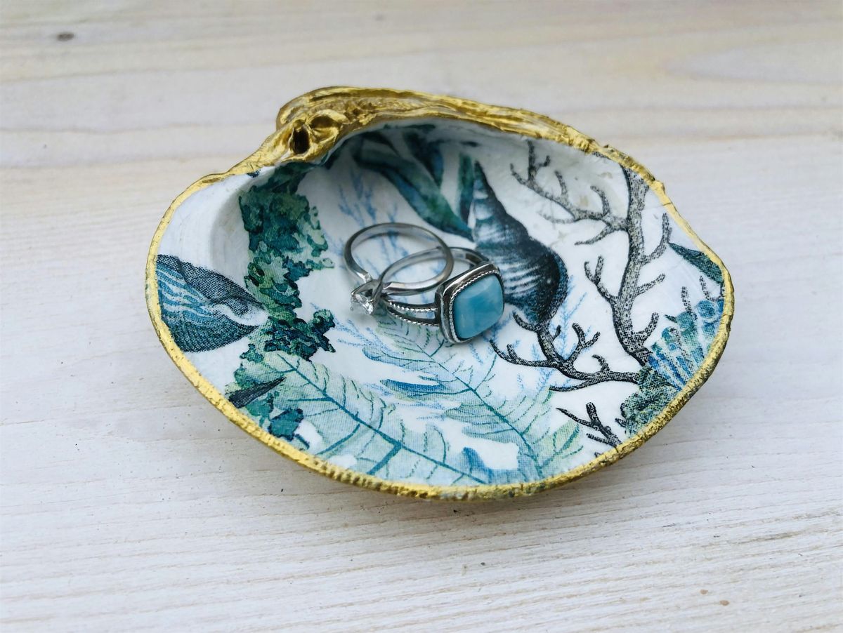 The workshop includes materials and tutorials for each participant to create 4 decoupage shells, each transformed into a beautiful and functional piece of art. The finished pieces can be used as a jewelry dish for rings, earrings, bracelets, and small keepsakes, or decorative accents for shelves, dressers, or coffee tables. Make some for yourself and give the rest to your friends and family!