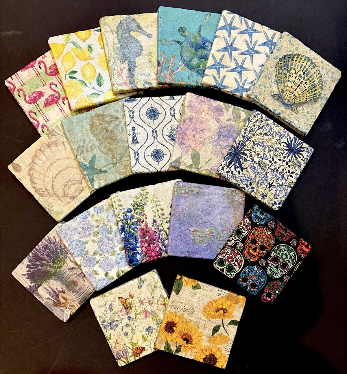 There will be all kinds of floral, ocean and miscellaneous themed napkins available to choose from. Examples pictured are just a few of the designs that will be offered. Make a set as a gift or for yourself