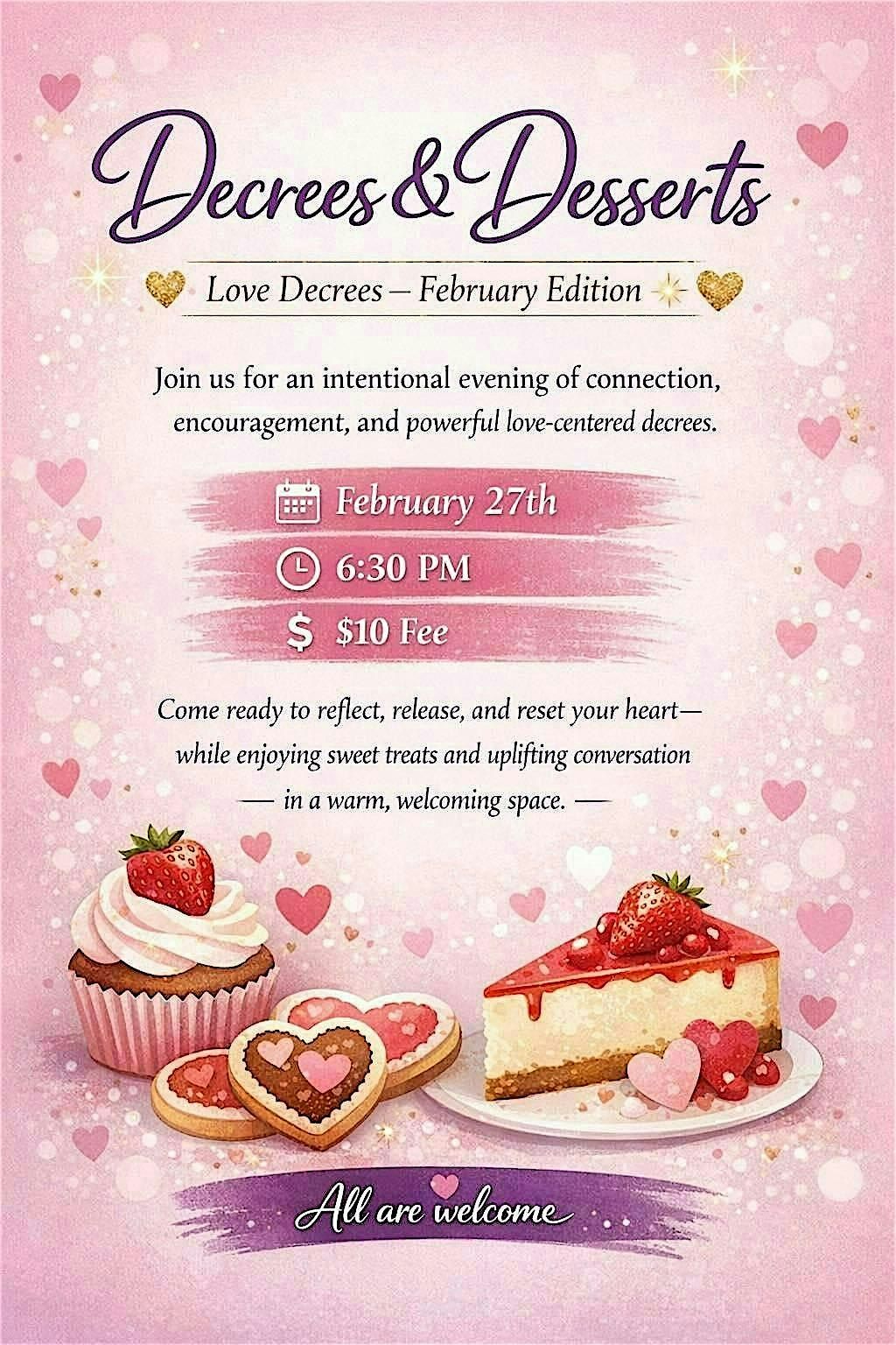 Decrees & Desserts is a faith-filled gathering created to encourage and uplift women through the power of God’s Word and meaningful connection. Join us for an evening of prayer, Scripture-based affirmations, and heartfelt fellowship paired with delicious desserts in a warm, welcoming atmosphere.