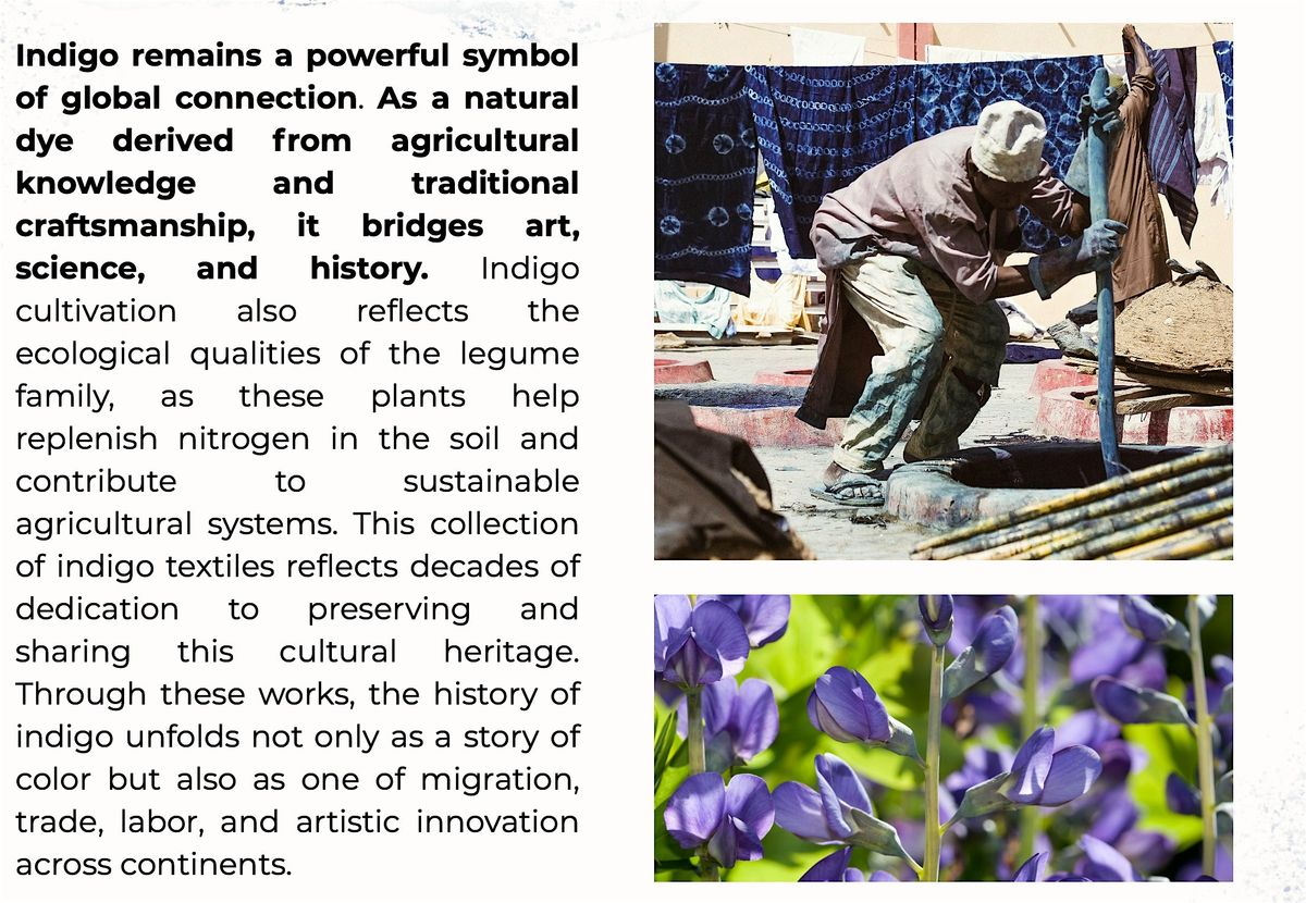 Indigo remains a powerful symbol of global connection. As a natural dye derived from agricultural knowledge and traditional craftsmanship, it bridges art, science, and history. Indigo cultivation also reflects the ecological qualities of the legume family, as these plants help replenish nitrogen in the soil and contribute to sustainable agricultural systems. This collection of indigo textiles reflects decades of dedication to preserving and sharing this cultural heritage. Through these works, the history of indigo unfolds not only as a story of color but also as one of migration, trade, labor, and artistic innovation across continents.