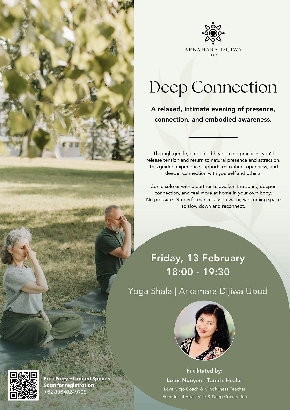 Deep Connection is a gentle, guided evening designed to help you slow down, reconnect with your body, open your heart, and feel more present and alive. Through embodied heart–mind practices, breath, simple movement, and guided relational exercises, you’ll explore what it feels like to connect from a place of ease rather than effort.