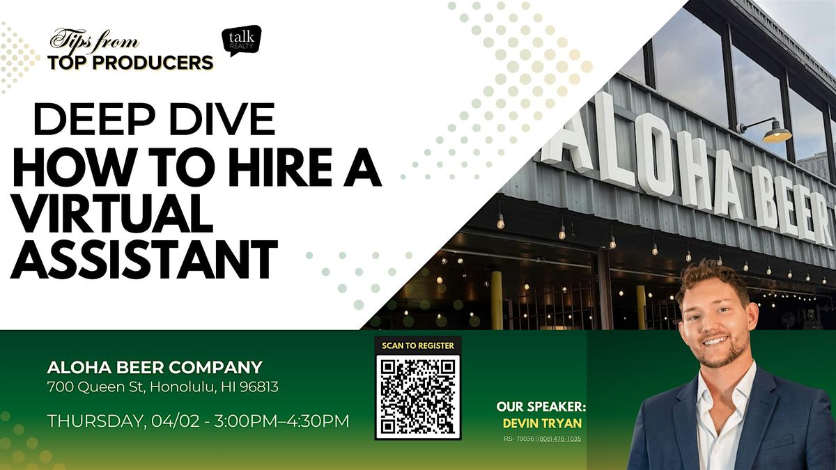 Deep Dive into on April 2 from 3 to 4:30 pm at Aloha Beer, Devin Tryan is hosting a hands-on deep dive into hiring a virtual assistant. Learn how to identify the tasks that drain your time, what to delegate first, and how a VA can help you stay consistent with follow up, marketing, lead management, and admin work. Devin will share his hiring process, training steps, and the systems he uses to keep a VA efficient and aligned. You will leave with a clear roadmap for hiring, onboarding, and managing a virtual assistant so your business can scale without burning you out.