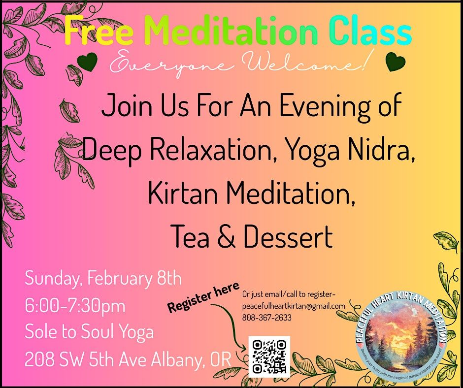 Kirtan, or music meditation, soothes the heart and soul! Come and experience it for yourself. We start with guided meditation, yoga breathing, seated yoga stretches, Yoga Nidra, and end with a joyful kirtan. We guarantee you will be more relaxed and at peace by the end of the class at the beautiful and serene Sole to Soul Yoga Studio in the heart of Albany.