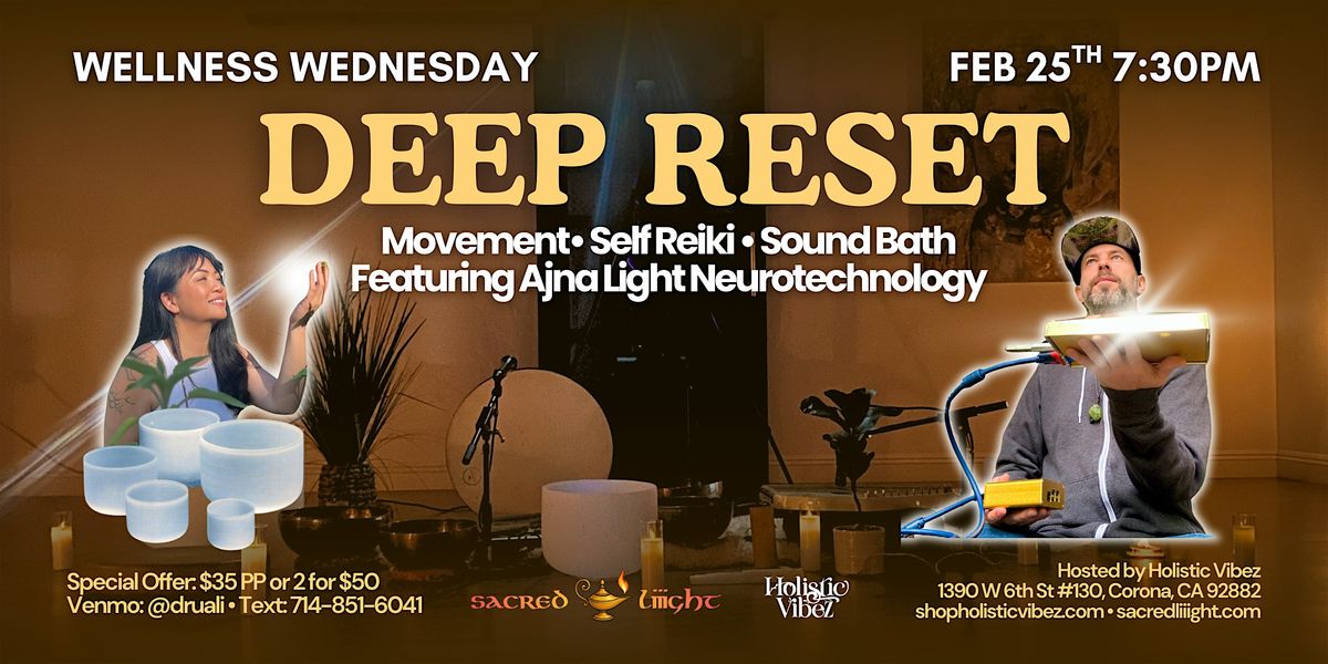 Wellness Wednesday: Deep Reset is a monthly sound healing and meditation experience in Corona, CA. Hosted by Evelyn and Dru Ali of Sacred Liiight, in collaboration with Holistic Vibez, this one-hour experience blends Ajna Light Neurotechnology, gentle movement, and vibrational sound, to support deep renewal in a calm, welcoming environment.
