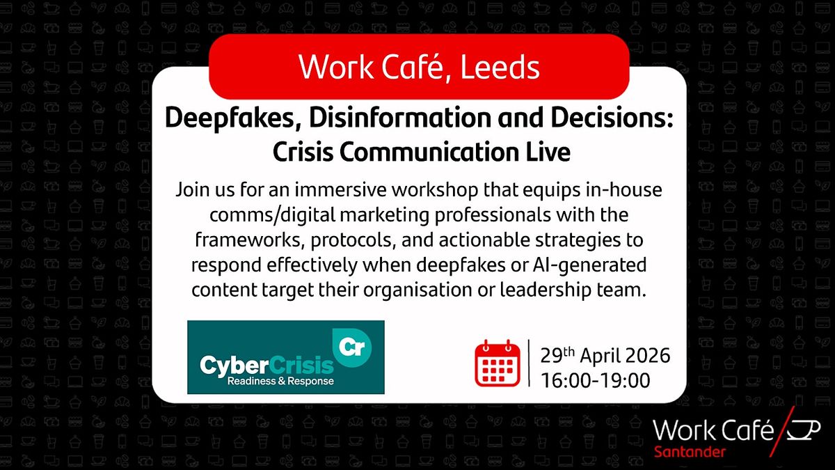 Join us from 16:00 on 29 April at The Work Café Leeds for an immersive workshop that equips in-house comms/digital marketing professionals with the frameworks, protocols, and actionable strategies to respond effectively when deepfakes or AI-generated content target their organisation or leadership team.
