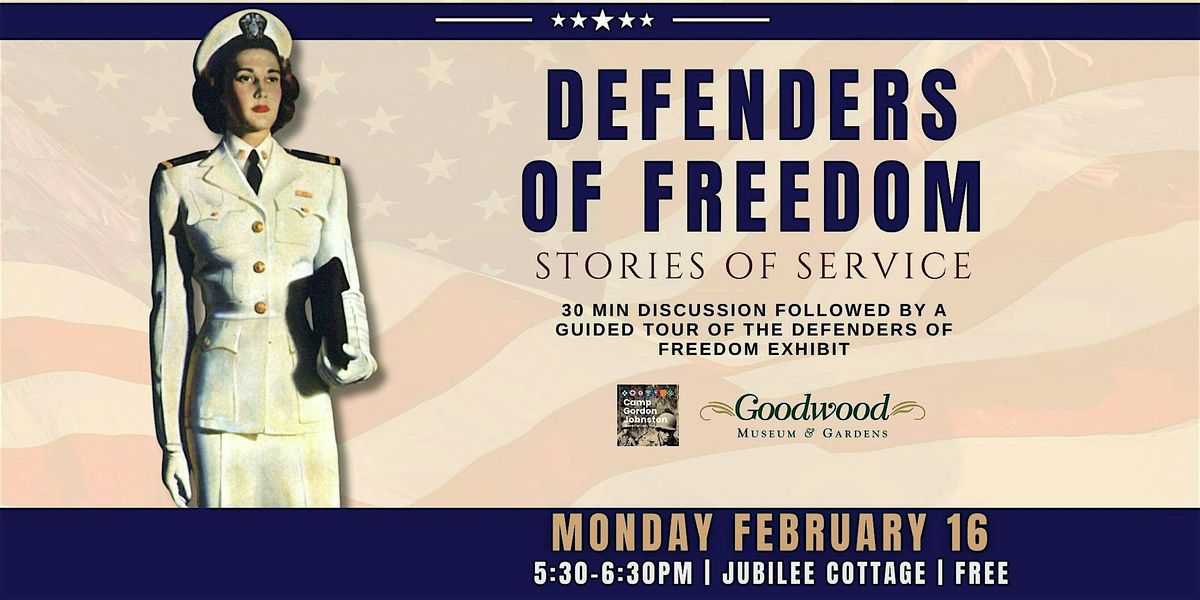 The evening begins with a 30 discussion/lecture in Jubilee Cottage, followed by a guided tour of the Defenders of Freedom exhibit.
