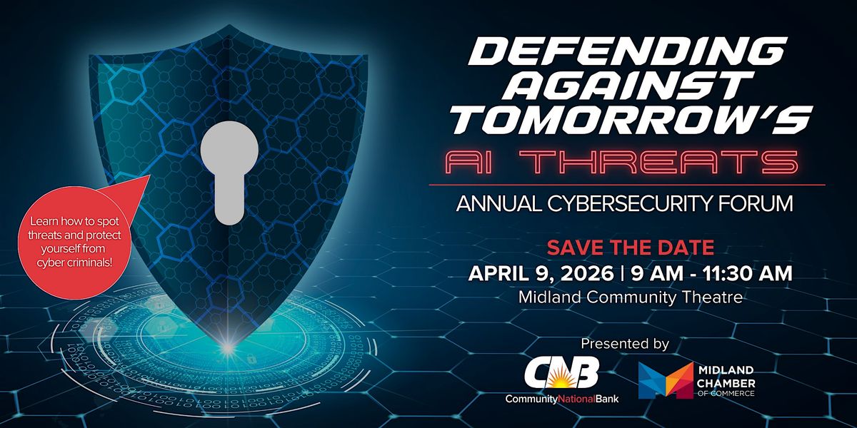 Welcome to the Defending Against Tomorrow's AI Threats - Annual Cybersecurity Forum! Join us at the Midland Community Theatre in Midland, TX, USA for a morning filled with valuable insights and tips on keeping your business safe from cyber threats. Our expert speakers will cover topics like data protection, network security, and risk management. Don't miss this opportunity to learn how to safeguard your business in today's digital world. See you there!