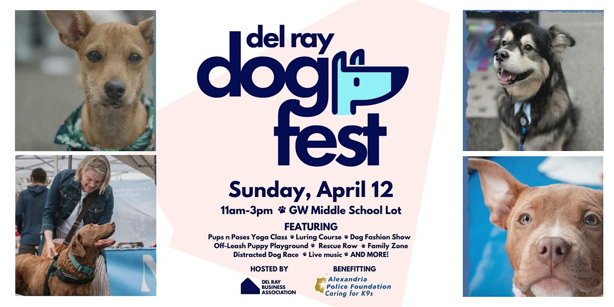 The 4th Annual Del Ray Dog Fest is a fun outdoor event that will include dog-centered activities, dog menu items, live music, vendors and food on Sunday, April 12th from 11am- 3pm at the George Washington Middle School parking lot. This festival is dog-friendly and takes place outdoors, rain or shine.