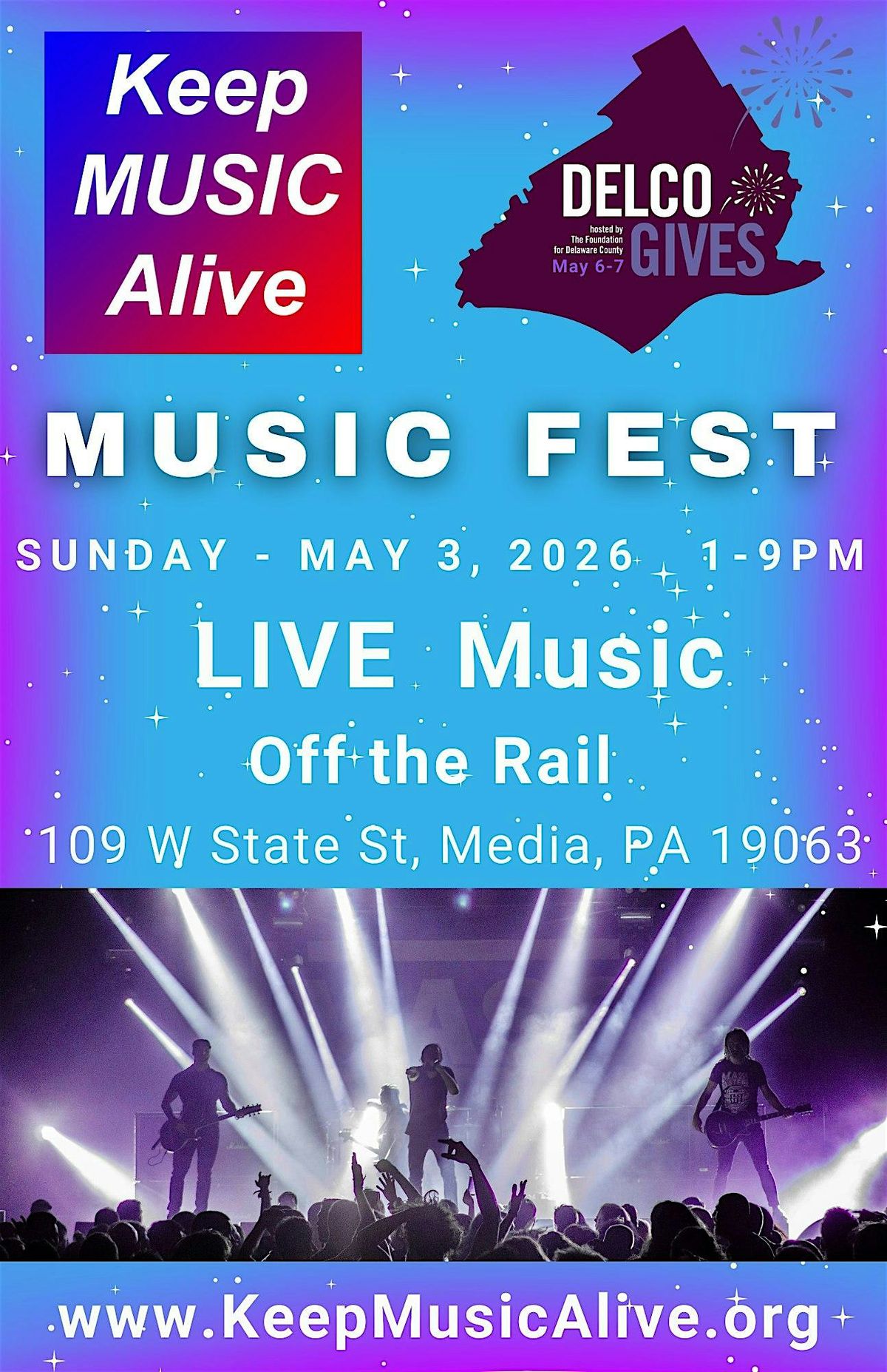 Come join us for the 3rd Annual Delco GIves Music Fest (formerly Telethon) at Off the Rail family-friendly sports eatery in downtown Media on State Street.