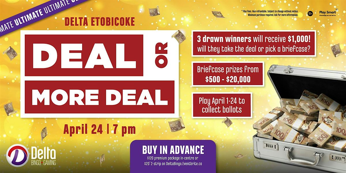 Join Delta Bingo & Gaming in Etobicoke for Deal or More Deal on Friday, April 24, 2026. This twist on Bingo will have two winners facing the ultimate decision: will they take the deal or will they risk it for the potenial of something greater?
