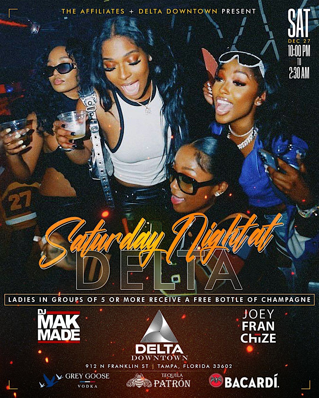 This Saturday TheAffiliatesCo is bringing Saturday Night Vibes to Tampa newest hotspot at Delta Downtown! Join us for a night of music and good vibes in the heart of Tampa. Our DJs Mak Made & Black Haze will be spinning the latest Hip Hop & RNB on the first floor. Don’t miss out on this epic Saturday night - See you there!