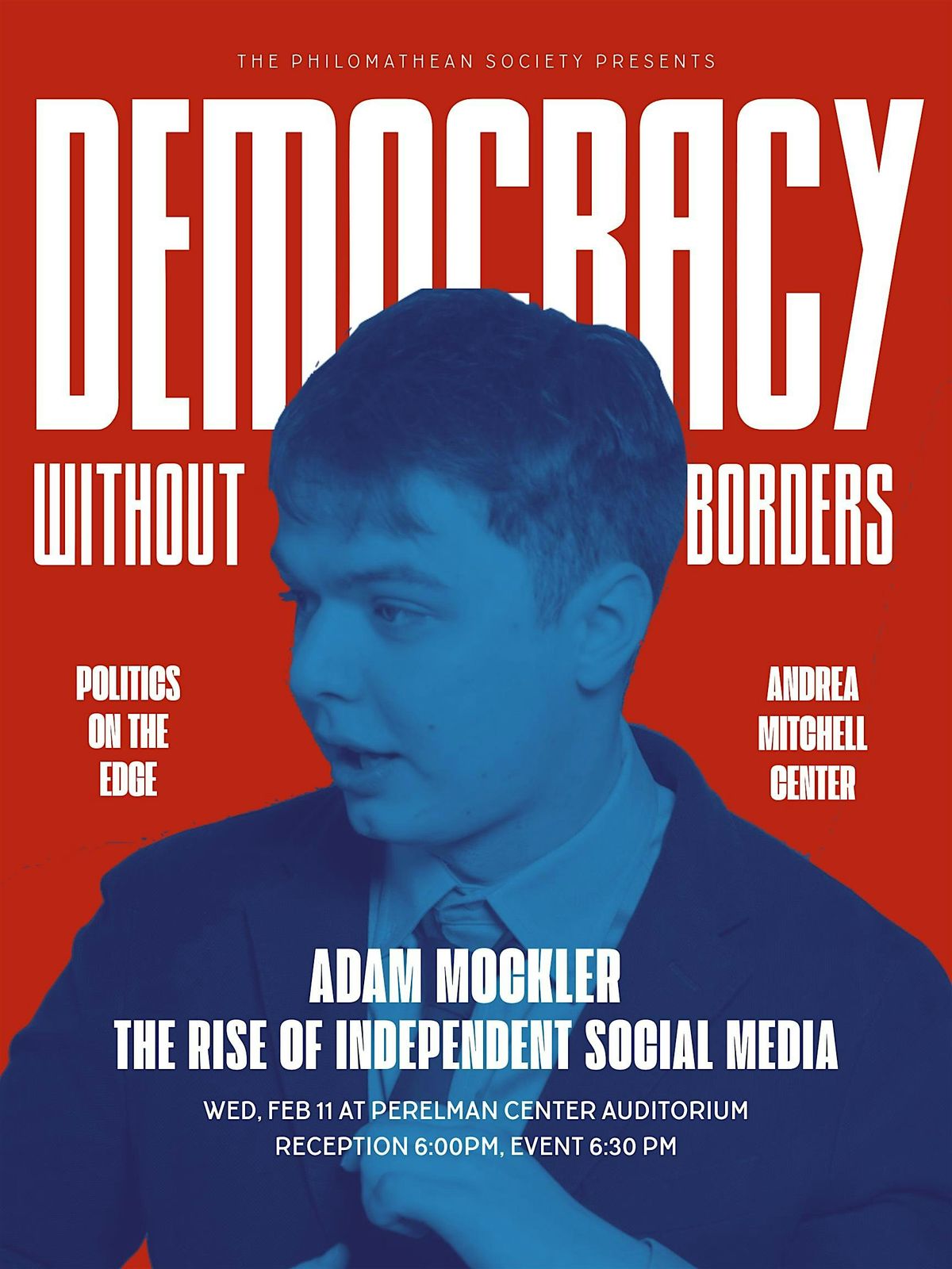 In these uncertain times of Trump’s second presidency, Gen-Z political commentator Adam Mockler has built a growing platform on social media from his direct and straightforward commentary, viral moments, and debates with everyone from political pundits to ordinary American citizens. His YouTube channel has over 1.5 million subscribers. Join him for a conversation about the state of American democracy today, and the role of the rising social media space in shaping our political future.
