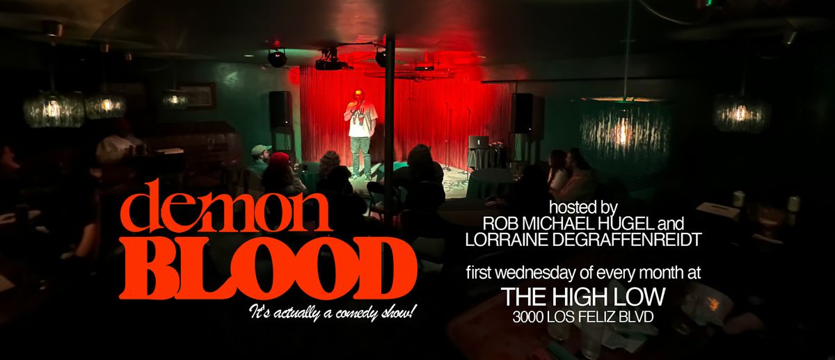 Demon Blood Comedy Show is a Donation based monthly stand up comedy showcase hosted by Lorraine DeGraffenreidt and Rob Michael Hugel occuring on the first Wednesday of each month in the Green Room at High Low Bar in Atwater Village.