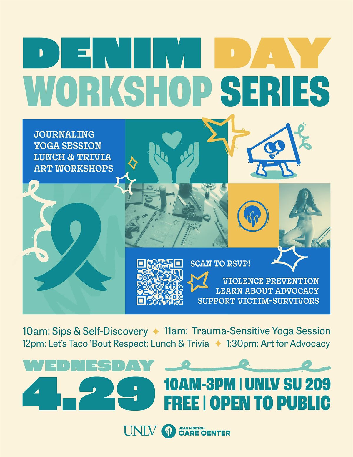 Join us for a full day honoring Denim Day through reflection, connection, and creativity. We’ll begin with Sips & Self-Discovery, a calm space for journaling, coffee, and setting intentions with support from Project Wellness. Then, move into Healing in Motion, a grounding yoga session designed to help you reset and recharge.