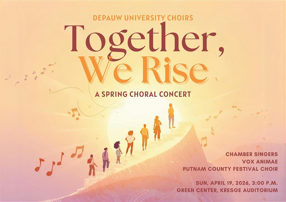 The Institute of Music's spring choral concert, "Together, We Rise," brings together the voices of DePauw Chamber Singers, Vox Animae and the Putnam County Festival Choir in a program celebrating unity, resilience and shared purpose. Spanning musical traditions from Johann Sebastian Bach to contemporary composers including Dr. Rosephanye Powell, Jocelyn Hagen and Sydney Guillaume, the concert explores how communities express faith, hope, memory and empowerment through song. Highlights include Bach’s powerful setting of Martin Luther’s Ein feste Burg ist unser Gott, vibrant gospel works honoring the legacy of Richard Smallwood, and the joyful combined-choirs finale One by One by Diane White-Clayton, a reminder that meaningful progress happens step by step—and that together, we rise.