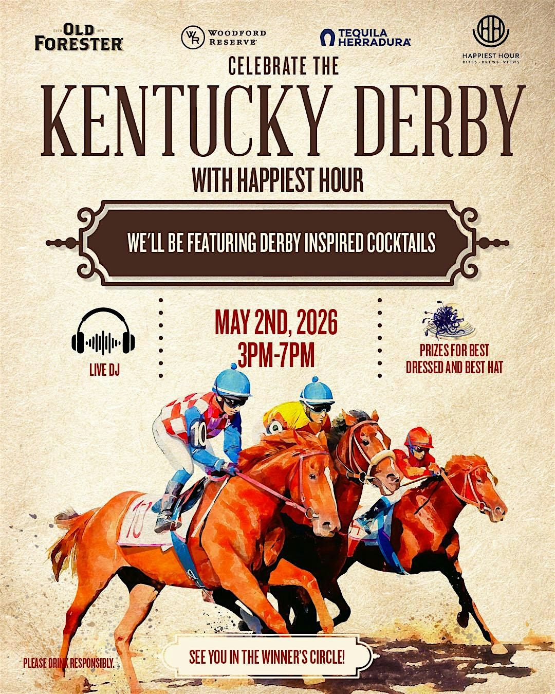 A live DJ from 3–7 PM will keep the vibes upbeat all afternoon, while TVs throughout the space stream live Kentucky Derby coverage, so you won’t miss a moment of the race.