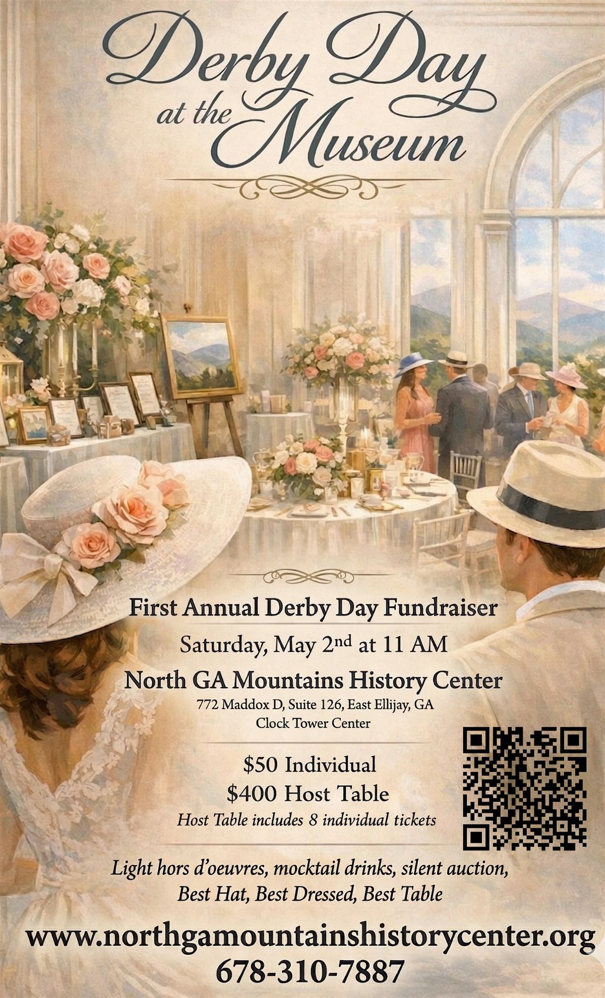 Info: Ladies and Gentlemen, North GA Mountains History Center cordially invites you to join us for our first annual Derby Day Fundraiser on Saturday, May 2nd at 11 AM, hosted at the history museum located at 772 Maddox Dr, Suite 126, East Ellijay in the Clock Tower Center. Enjoy light hors d’oeuvres, deserts, mocktail drinks, a silent auction, and votes for sale for our Derby-inspired attire, Best-of-Competition: Best Hat, Best Dressed (men and women), and Best Table.