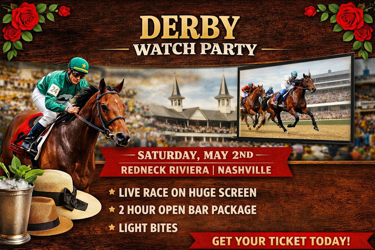 Celebrate Derby Day in the heart of Nashville at Redneck Riviera. Join us on the second floor for an exciting watch party featuring festive cocktails, great music, and a lively Derby Day crowd.