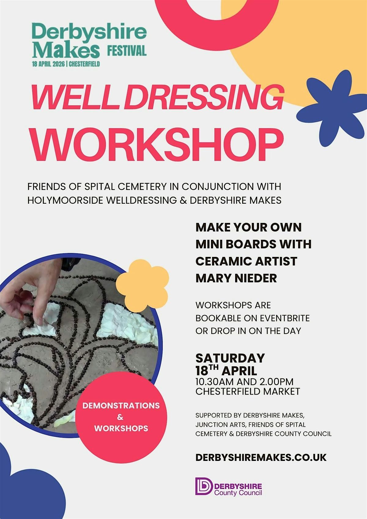 There is a morning and afternoon workshop. Each lasts 90 minutes. Mary will demonstrate the traditional Derbyshire art of well dressing and you will be invited to make your own mini well dressing using clay and natural materials. Please check in about 10 minutes before the start of your workshop.