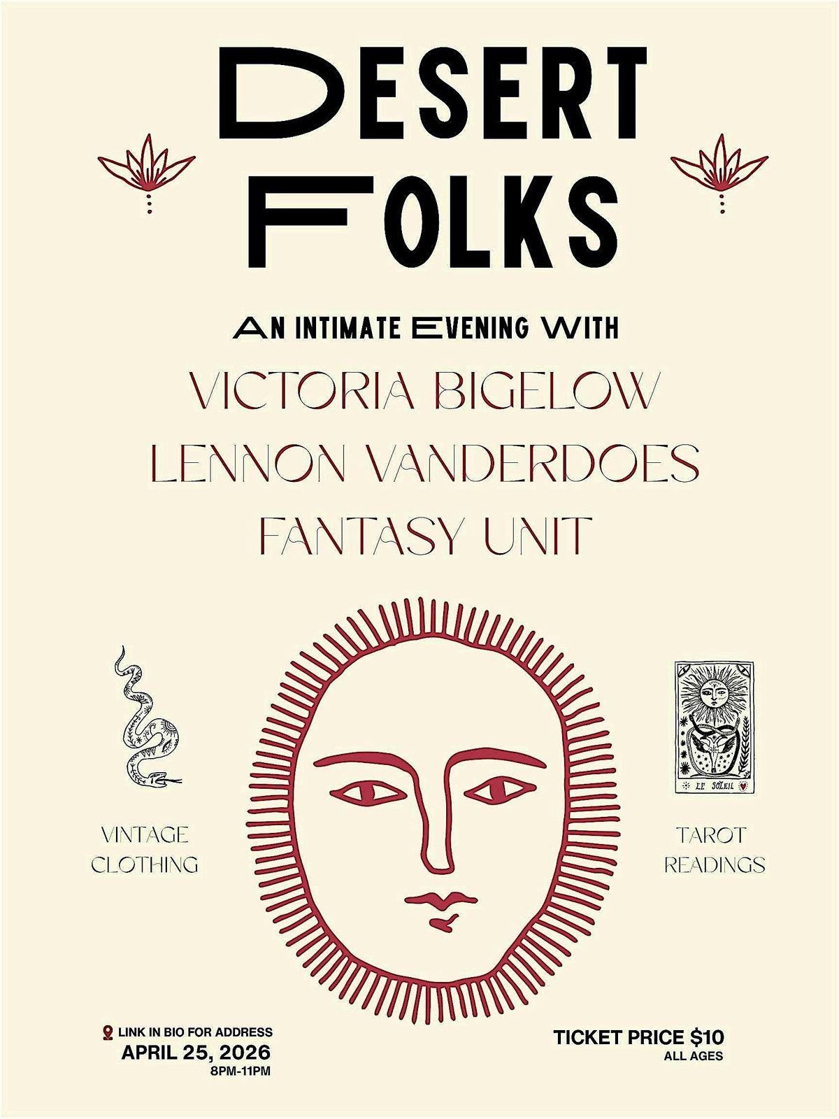 Join us in a chill, all ages setting for an intimate showcase of local folk/indie music + curated vintage clothing and tarot readings :)