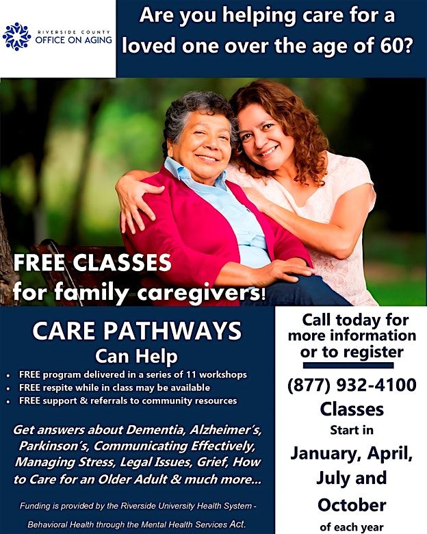 Workshops are offered throughout the county of Riverside to individuals caring for a family member 60 years or older. Respite care can be arranged for the care recipient (dependent on funding). Caregivers must register for the workshop before attending.
