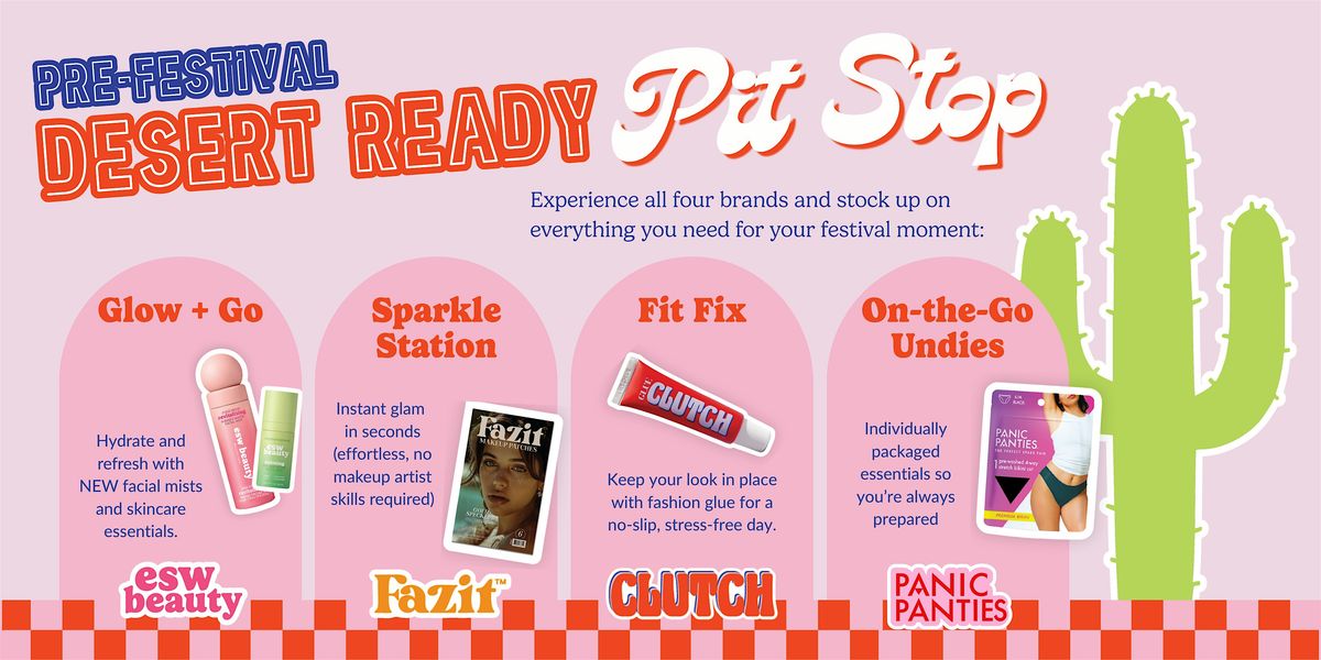 Desert Ready Pit Stop Get festival-ready with ESW Beauty, Fazit, Clutch Glue & Panic Panties. Glow, glam & stock up on essentials.About this Event