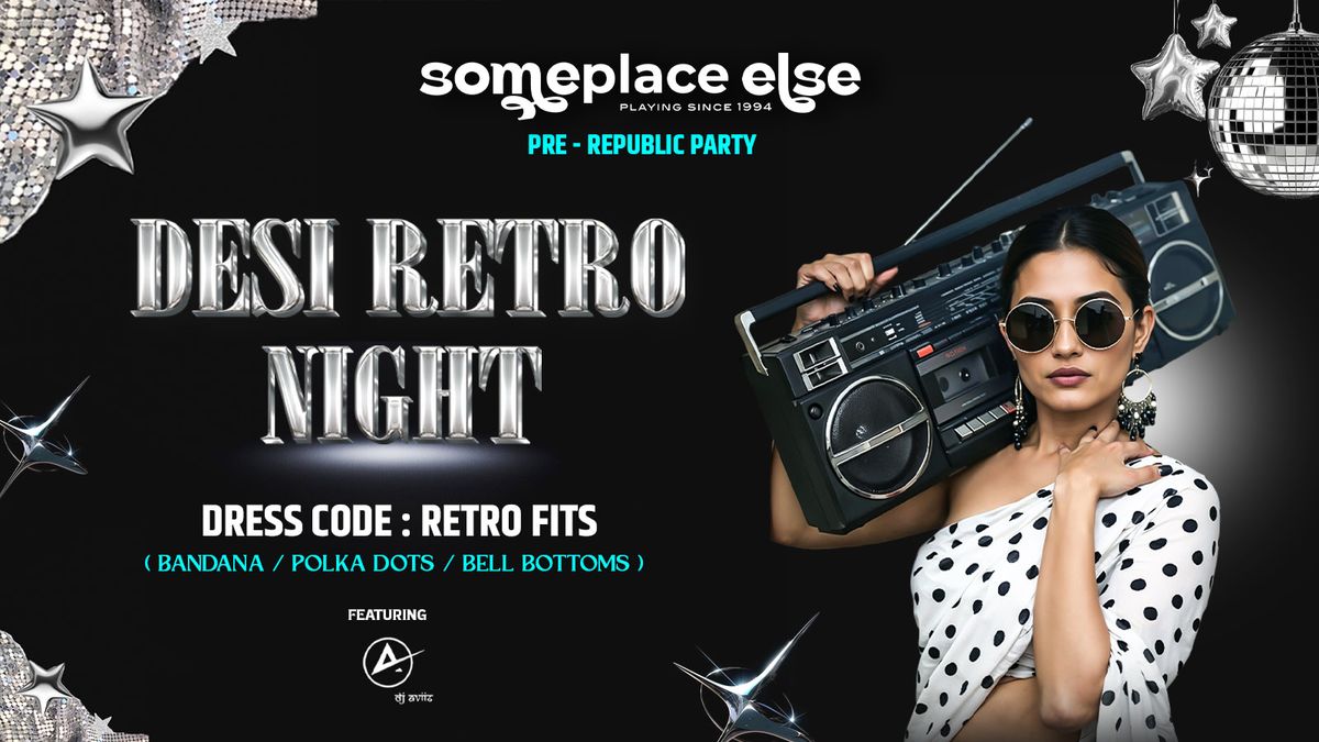 Desi Retro Night | Pre-Republic Party at Someplace ElseTurn back time and groove to the golden era of Bollywood ✨Someplace Else brings you Desi Retro Night — a high-energy barIt’s time to rewind to the era of classic Bollywood beats, bell bottoms and bandanas. ?✨Join us for a Pre-Republic Desi Retro Night filled with iconic music, retro fashion and high-energy vibes.Come dressed retro and let nostalgia take over the dance floor.