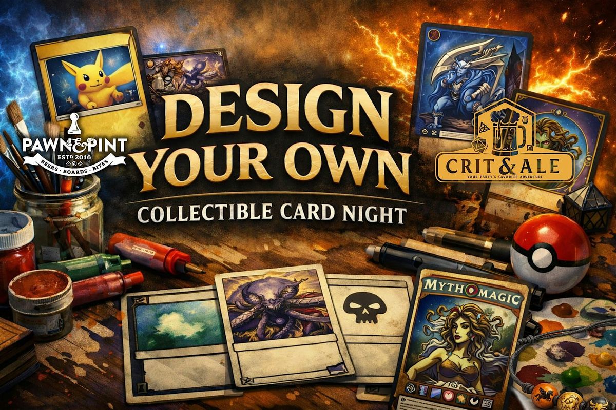 Calling all artists, card gamers, and creative minds.Join us for a hands on creative workshop where you’ll design your very own collectible or TCG style card. Whether you’re inspired by fantasy creatures, overpowered abilities, clever mechanics, or just want to make something weird and wonderful, this event is all about creativity and self expression.Whether you’re a fan of Magic the Gathering, Pokémon, Yu Gi Oh, or any other trading card game, this event is the perfect chance to flex your artistic muscle and create something uniquely yours.We’ll provide blank cards along with paints, pens, and markers so you can jump right in. No artistic experience required. Come sketch, color, experiment, and bring your card ideas to life in a relaxed, welcoming space.Design a serious card. Design a joke card. Design the most broken card imaginable. The choice is yours.All supplies are included. Just bring your imagination.Hosted by Crit and Ale LLC