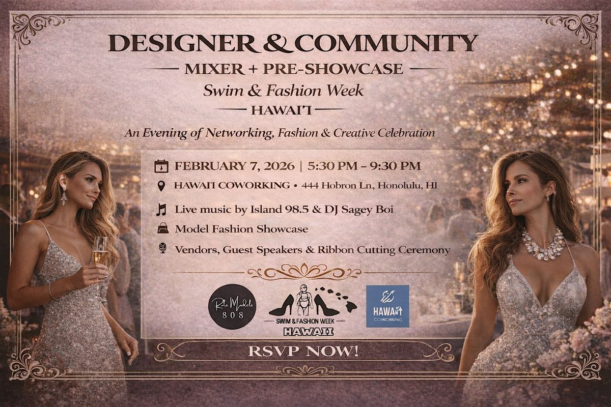 The Designer & Community Mixer + Pre-Showcase is an official Swim & Fashion Week Hawaii gathering created to connect Hawaii's fashion, creative and entrepreneurial community in an elevated, welcoming setting.